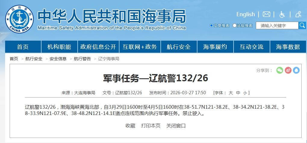 据中国海事局网站消息,大连海事局发布航行警告,3月29日16时至4月5日16时,渤海海峡黄海北部执行军事任务,禁止驶入。