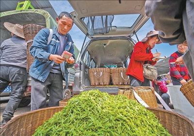 3月以来,四川省雅安市名山区数十万亩茶园迎来春茶大规模采摘,茶农与收购商从四面八方汇聚于此,鲜叶交易市场进入一年中最繁忙的交易季。