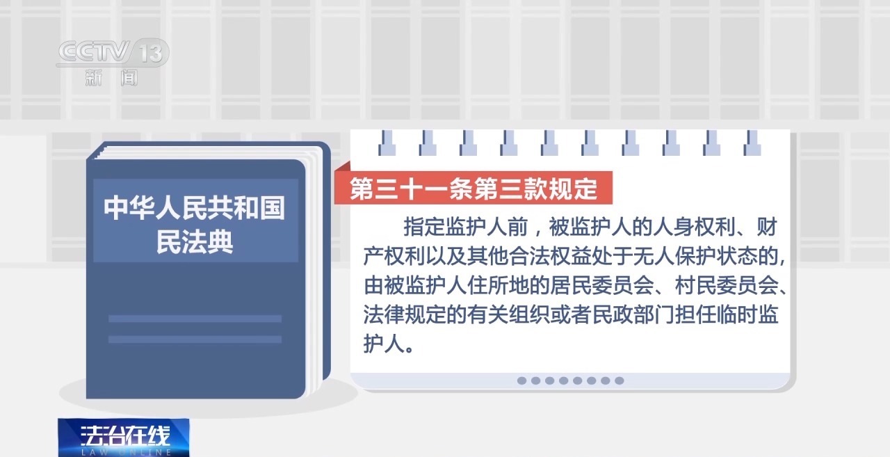 依据民法典第三十一条第三款规定,指定监护人前,被监护人的人身权利、财产权利以及其他合法权益处于无人保护状态的,由被监护人住所地的居民委员会、村民委员会、法律规定的有关组织或者民政部门担任临时监护人。