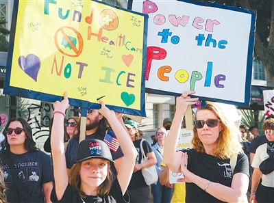 不久前,人们在美国加利福尼亚州洛杉矶市政厅前手举标语参加示威活动,抗议美国联邦当局对移民暴力执法。 |