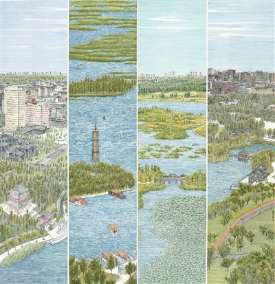 来了才发现,其实我是故地重游了。早在2007年,我在鲁迅文学院读书时,就曾和同学们来白洋淀社会实践,写过一篇散文《逆光里的白洋淀》。而白洋淀,如今已不再只是一片芦苇荡,经过生态治理后水量丰沛、水质清冽。一带碧水环绕着七层八角的安和塔,它是按“容城古八景”之一的白塔进行设计建造的。我迫不及待地登塔俯瞰雄安新区风光,眼前湖光秋色、莲叶田田,草木葱茏中坐落着庄重的图书馆、展览馆和会议中心。远处,长空下,是高楼林立的现代化高新产业区,以及安宁祥和的多彩居民社区,自然生态、历史文化和人居环境和谐融合。古人云:“水不在深,有龙则灵”,又云“智者乐水”,新时代的白洋淀赋予雄安新区智慧灵气,聚集了各行各业的“雄才”,当真是“有龙则灵”。