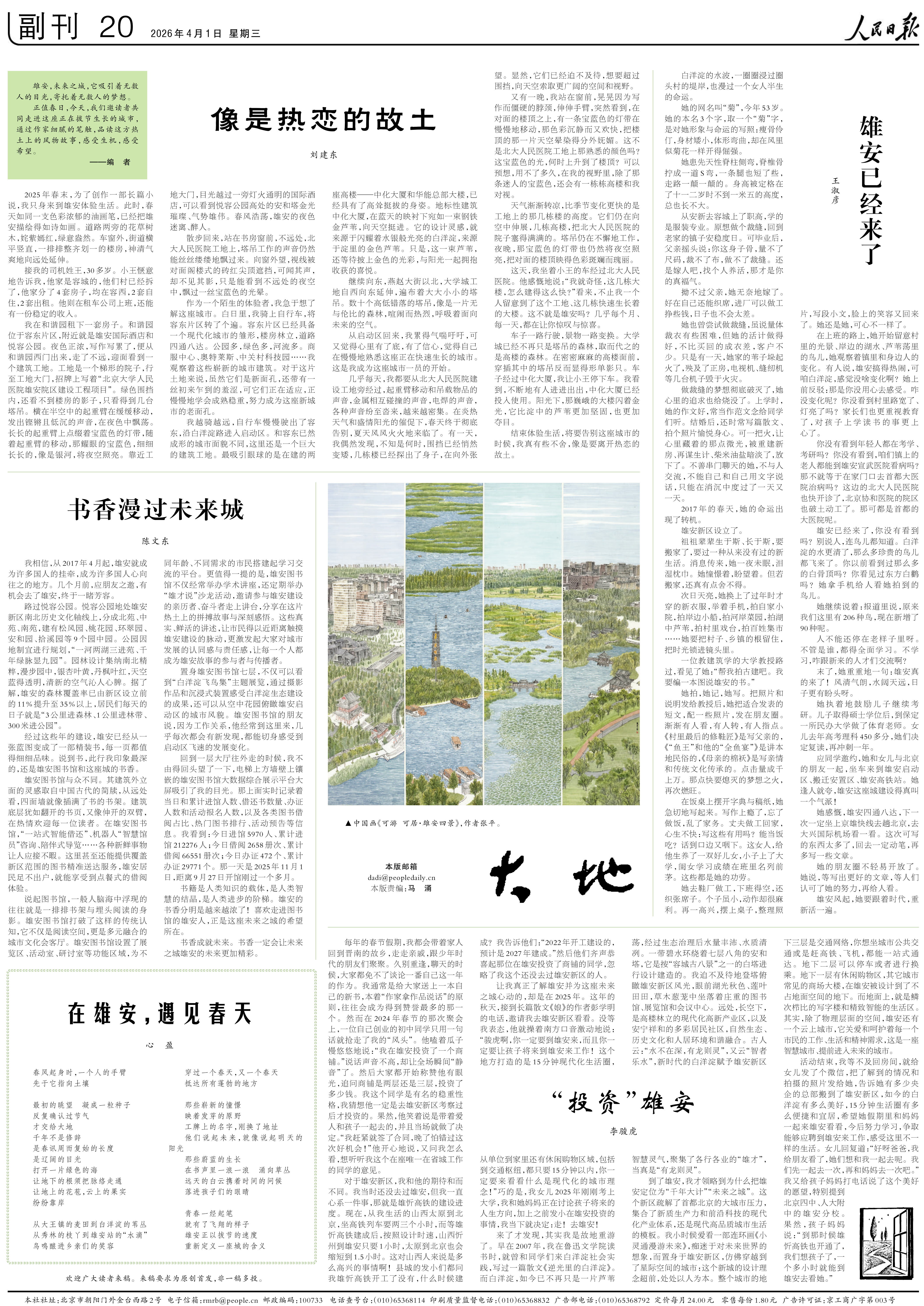 让我真正了解雄安并为这座未来之城心动的,却是在2025年。这年的秋天,接到长篇散文《娘》的作者彭学明的电话,邀请我去雄安新区看看。没等我表态,他就操着南方口音激动地说:“骏虎啊,你一定要到雄安来,而且你一定要让孩子将来到雄安来工作!这个地方打造的是15分钟现代化生活圈,从单位到家里还有休闲购物区域,包括到交通枢纽,都只要15分钟以内,你一定要来看看什么是现代化的城市理念!”巧的是,我女儿2025年刚刚考上大学,我和她妈妈正在讨论孩子将来的人生方向,加上之前发小在雄安投资的事情,我当下就决定:走!去雄安!