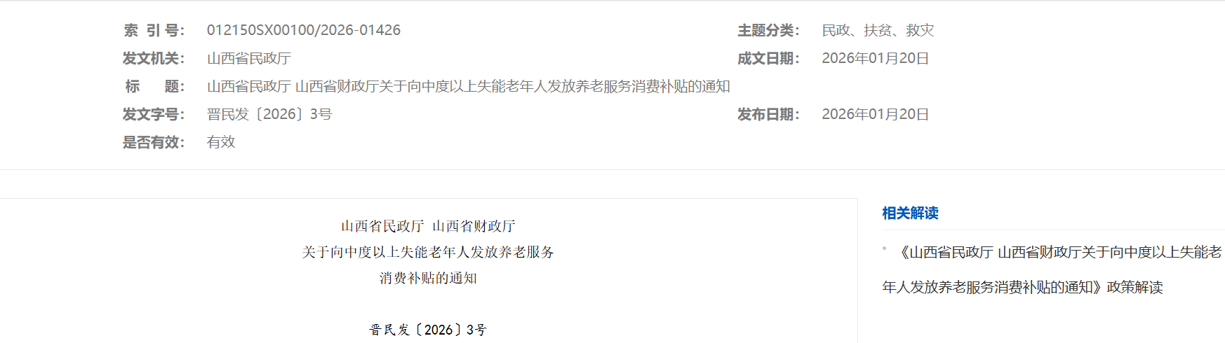 近日,山西省民政厅、财政厅联合印发通知,计划从2026年1月1日至12月31日实施中度以上失能老年人养老服务消费补贴项目,补贴资金每月最高抵扣额度为800元,通过全国统一的“民政通”政务服务平台,以电子消费券形式,按自然月发放至符合条件的老年人个人账户,助力失能老人照护服务。