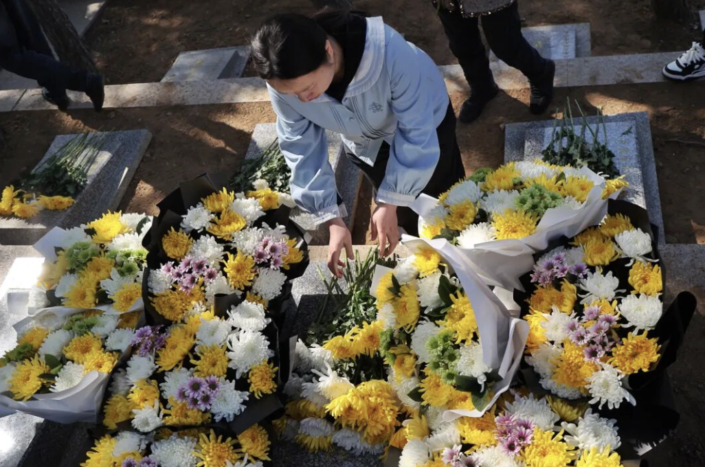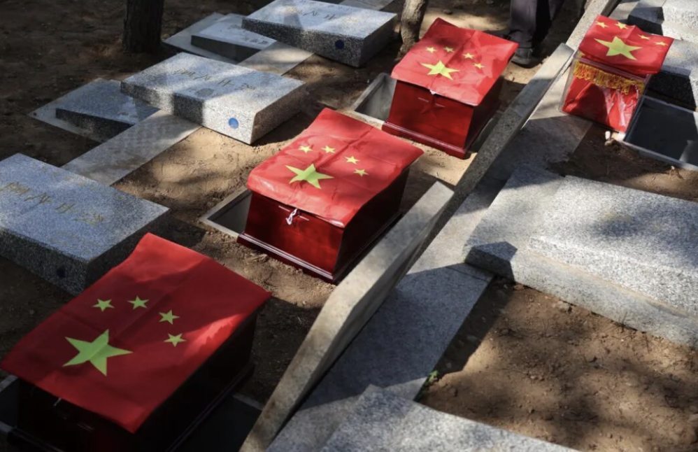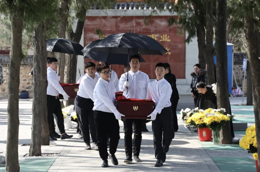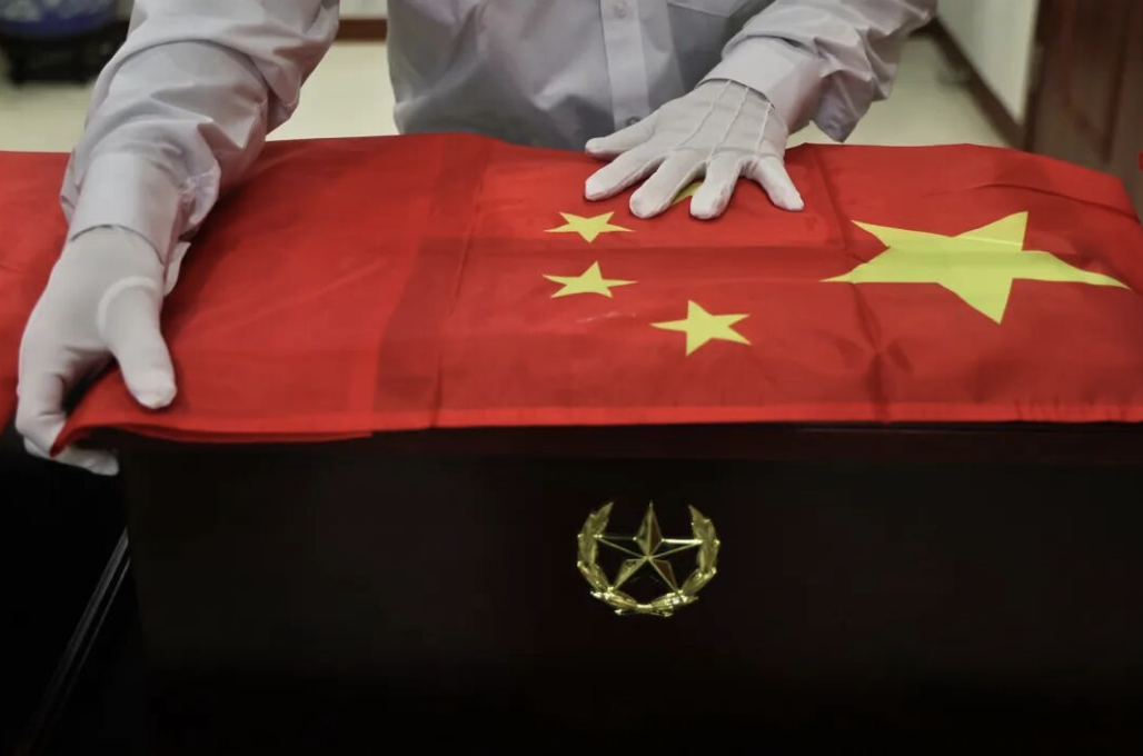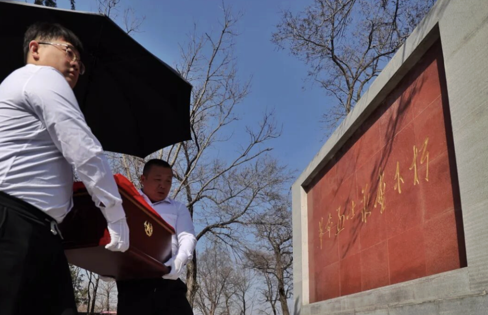4月2日上午8时,工作人员整理好4位烈士的灵柩,覆盖上鲜红的国旗。周宏勃烈士的家人一遍又一遍地擦拭着烈士的灵柩,泪水滑落。4位烈士的灵柩从殡仪馆起灵,运送至八达岭烈士陵园。