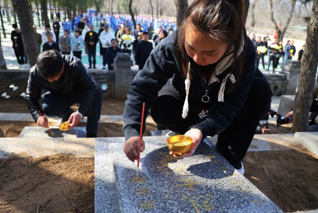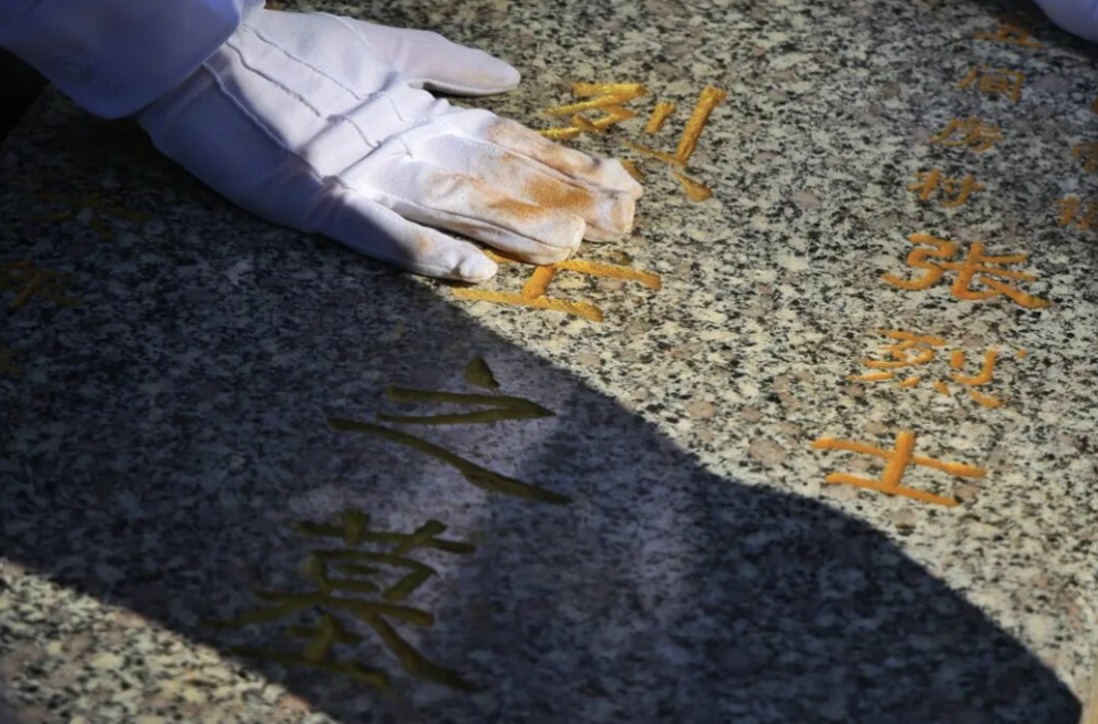 张山营镇的工作人员和周宏勃的妻子分别为烈士墓碑描金。三位无名烈士与见义勇为的周宏勃烈士相伴,虽身处不同时代,但忠勇大义的精神一脉相承、永垂不朽。伴随着深情旋律,众人依次敬献花束与白菊,朵朵鲜花寄托无尽哀思。
