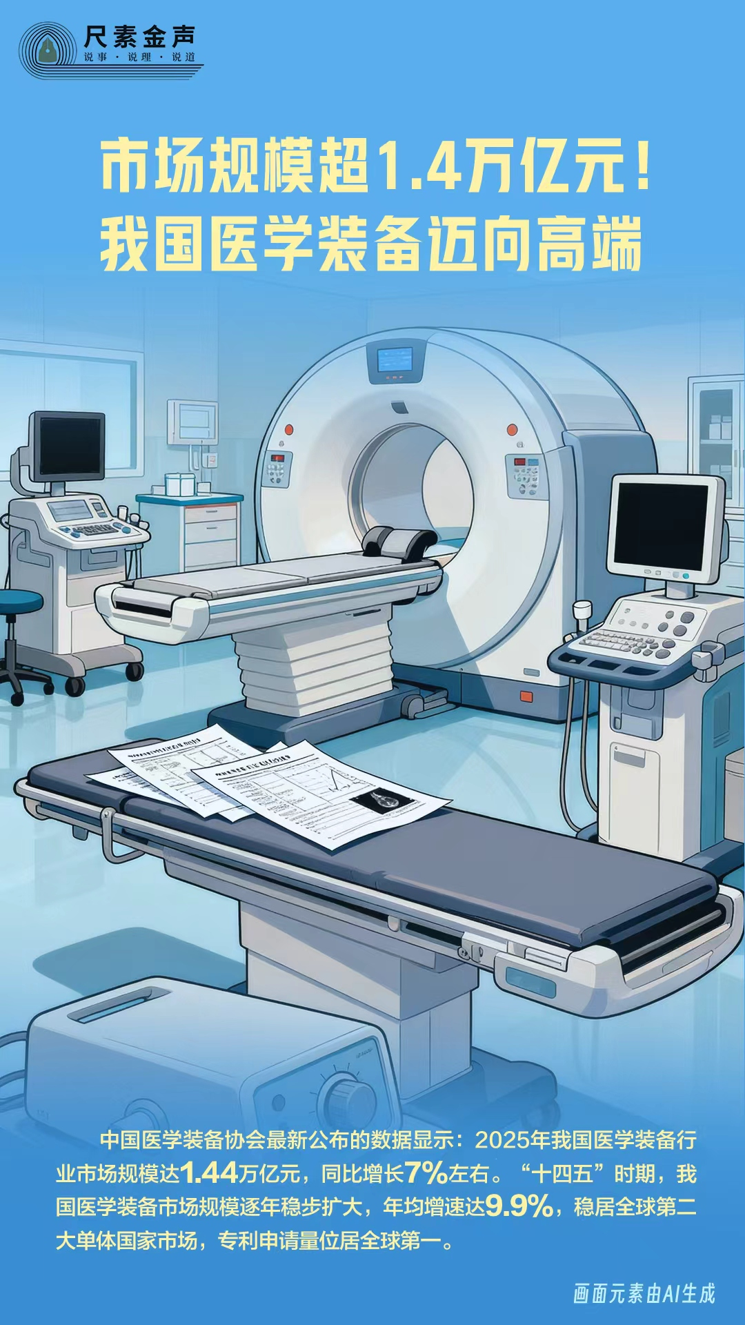 中国医学装备协会最新公布的数据显示:2025年我国医学装备行业市场规模达1.44万亿元,同比增长7%左右。“十四五”时期,我国医学装备市场规模逐年稳步扩大,年均增速达9.9%,稳居全球第二大单体国家市场,专利申请量位居全球第一。