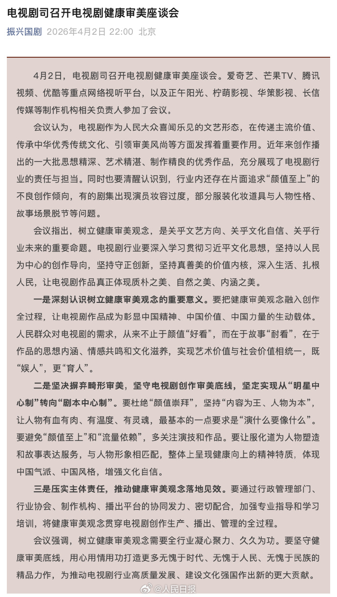 4月2日,国家广播电视总局电视剧司召开电视剧健康审美座谈会。会议指出,坚决摒弃畸形审美,坚守电视剧创作审美底线,坚定实现从“明星中心制”转向“剧本中心制”。要杜绝“颜值崇拜”,坚持“内容为王、人物为本”,让人物有血有肉、有温度、有灵魂,最基本的一点要求是“演什么要像什么”。要避免“颜值至上”和“流量依赖”,多关注演技和作品。要让服化道为人物塑造和故事表达服务,与人物形象相匹配,整体上呈现健康向上的精神特质,体现中国气派、中国风格,增强文化自信。