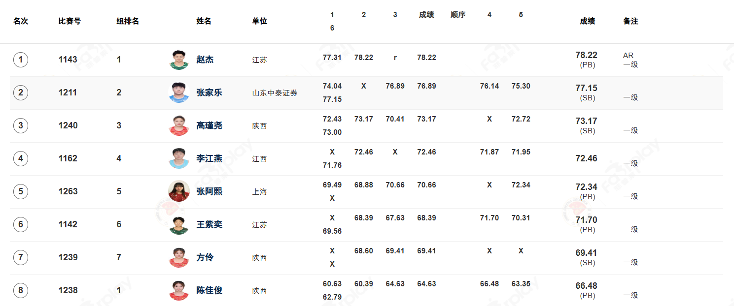 本场比赛中,赵杰在第一投便投出77米31的佳绩,展现出上佳的竞技状态。第二投中,赵杰投出78米22的成绩,将师姐王峥的亚洲纪录提升了54厘米,并凭此成绩夺得冠军。U20世界纪录保持者张家乐凭借最后一投的77米15夺得亚军,距离自己的最好成绩只有9厘米。