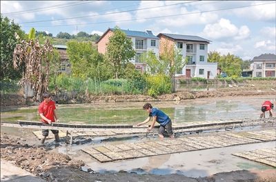 “人数相同的情况下,利用‘天车’一天能摆8000盘,折合4亩地,快4倍。”周腾鹏说,“重庆丘陵广布,机械传送带还能突破地形限制,更方便。”待幼苗长壮、裹成卷,再用传送带送回路边,运去大田插秧。
