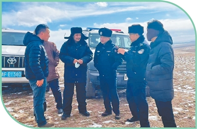 曲洋才让(右四)在与工作人员商议巡逻路线。 |