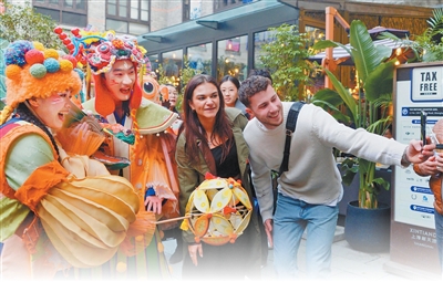 在上海新天地,外国游客与民俗巡游表演的演员合影留念。 |
