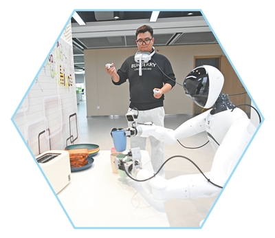 在中国雄安集团数字城市科技有限公司具身智能训练场,工作人员对机器人进行具身智能训练。 |