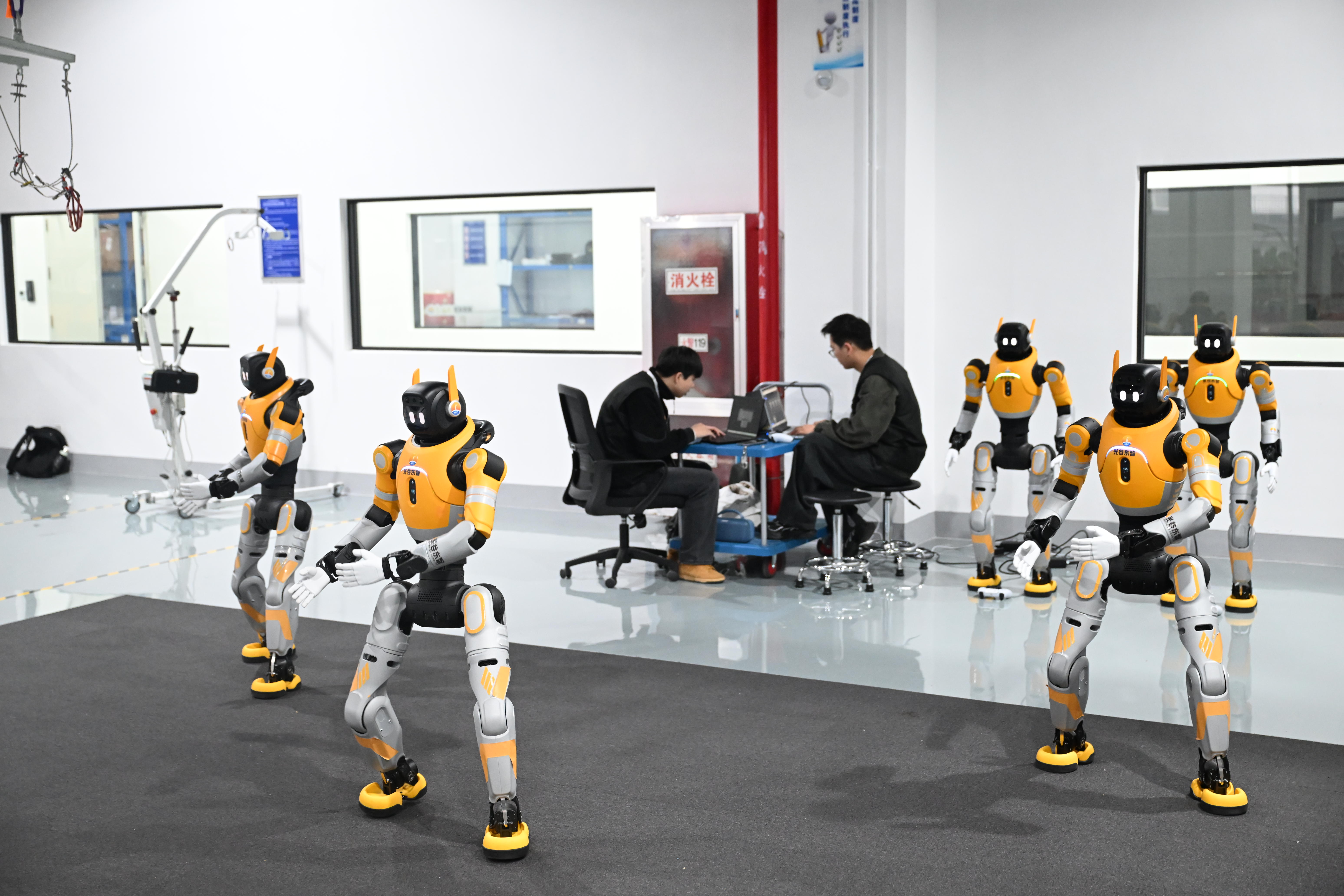 湖北光谷东智具身智能技术有限公司工作人员正在测试人形机器人。光谷融媒体中心供图