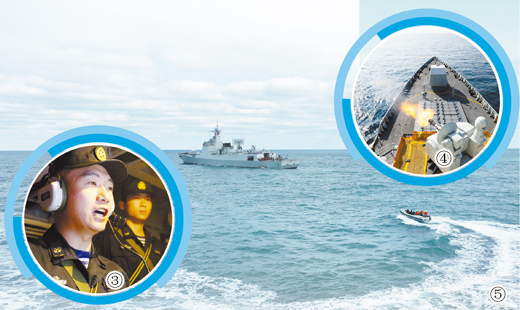 图①:护航期间,包头舰开展舰载直升机跨昼夜飞行训练。王宁川摄 图②:包头舰开展实射导弹训练。 图③:包头舰战士正在演练。 图④:防空反导演练中,包头舰组织副炮射击。 图⑤:包头舰在组织临检拿捕训练。 图②至图⑤均为熊勤鑫摄