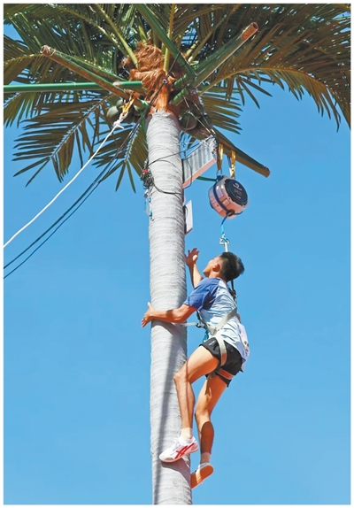 根据赛事性质,可选择符合标准的天然椰子树,也可选择内部为钢架、外部包树脂的仿真椰子树。比赛既能在个人之间比速度,也可为团队接力协作。“比赛期间,我们和各地选手交流爬树心得,越来越多的人对这项运动感兴趣。”朱亚光说。