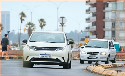 在乌拉圭首都蒙得维的亚,一辆中国电动汽车(前)在路上行驶。尼古拉斯·塞拉亚摄(新华社发)