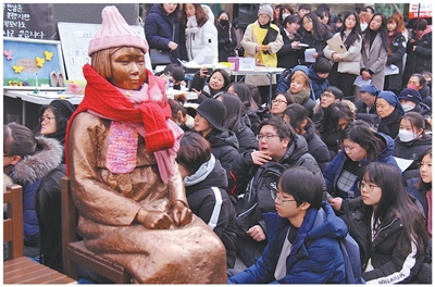 韩国民众在首都首尔一处象征日军“慰安妇”受害者的“和平少女”雕像周围举行抗议活动。 |
