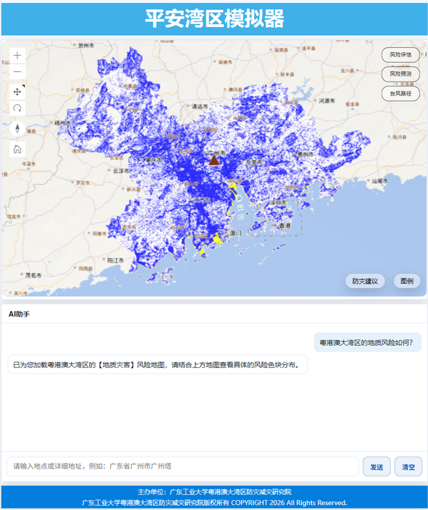 近日,广东工业大学粤港澳大湾区防灾减灾研究院自主研发“平安湾区AI模拟器之灾害风险模块”正式上线。该模块以粤港澳大湾区为核心,辐射全球,综合考虑地质、工程、气象、生态、人口等因素,开展全球尺度地质灾害、洪涝灾害、大风灾害等多灾种风险实时智能评估和预测,并融合大语言模型,实现了风险评估和预测结果的AI检索增强生成可视化服务。该模块在常规条件下灾害风险分辨能力为30米-90米,风险评估时效为2小时,风险预测时效为6小时,风险分析速率每千平方公里小于1秒,结果实时更新频率取决于各地区气象数据发布时间。该模块目前主要面向防灾减灾救灾相关专业机构提供低成本、低门槛、高性能的服务,用户可通过模拟器的AI助手实时获取不同灾种风险评估和预测结果。