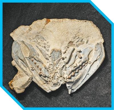 钝齿宏颌鱼化石,发现于云南曲靖志留纪晚期(约4.23亿年前)地层中,全长1米有余,是当时最大的鱼类。从完整的头颅化石中可以看到,嘴里交错长着小帽状的“齿垫”,上面密布小牙。