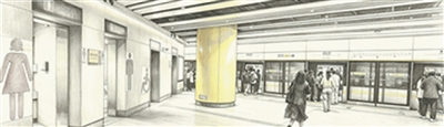 深圳地铁黄木岗综合交通枢纽负二层公共厕所。AI修饰生成素描画