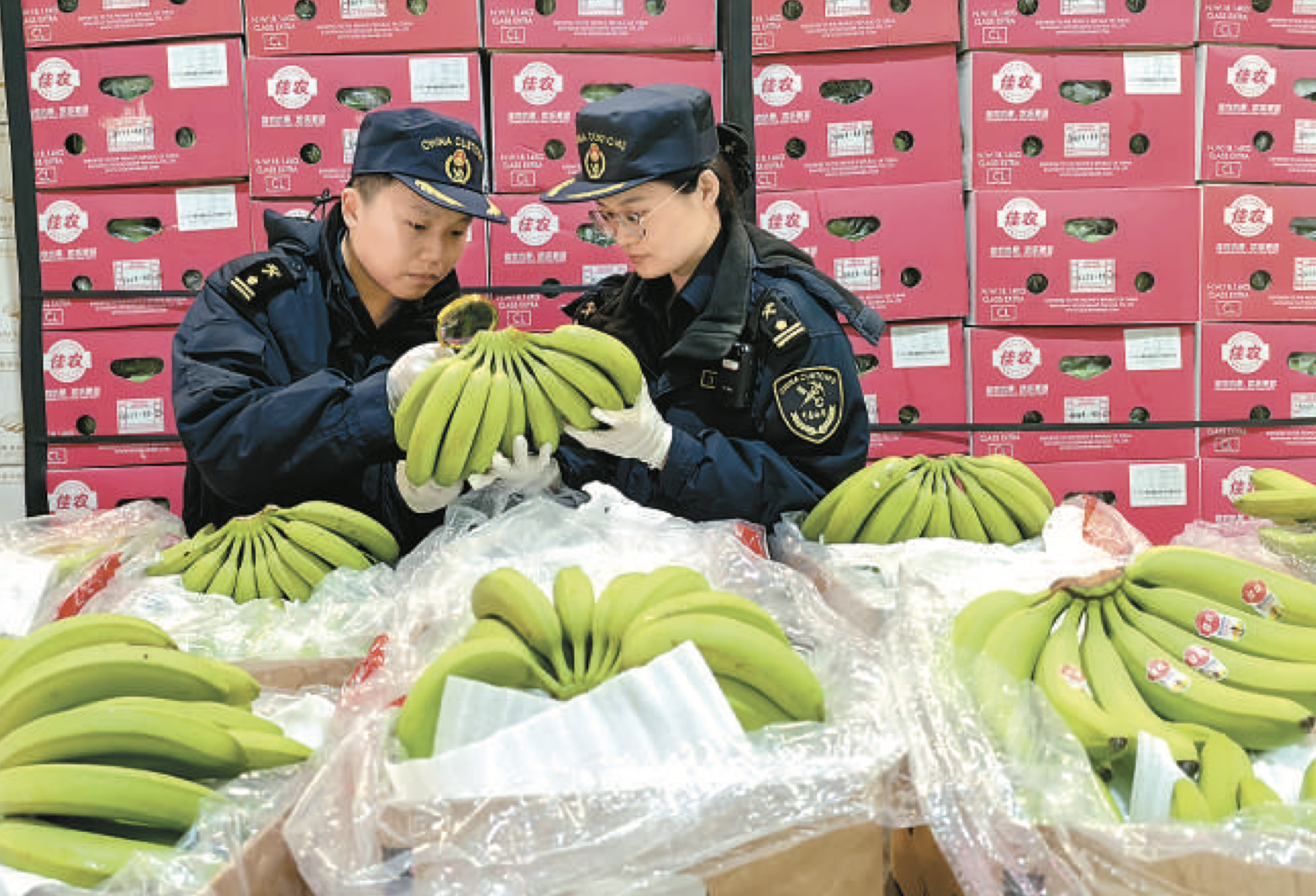 4月13日,宁波海关关员在浙江宁波梅山国际冷链仓库查验进口香蕉。朱佳娜摄(宁波海关供图)
