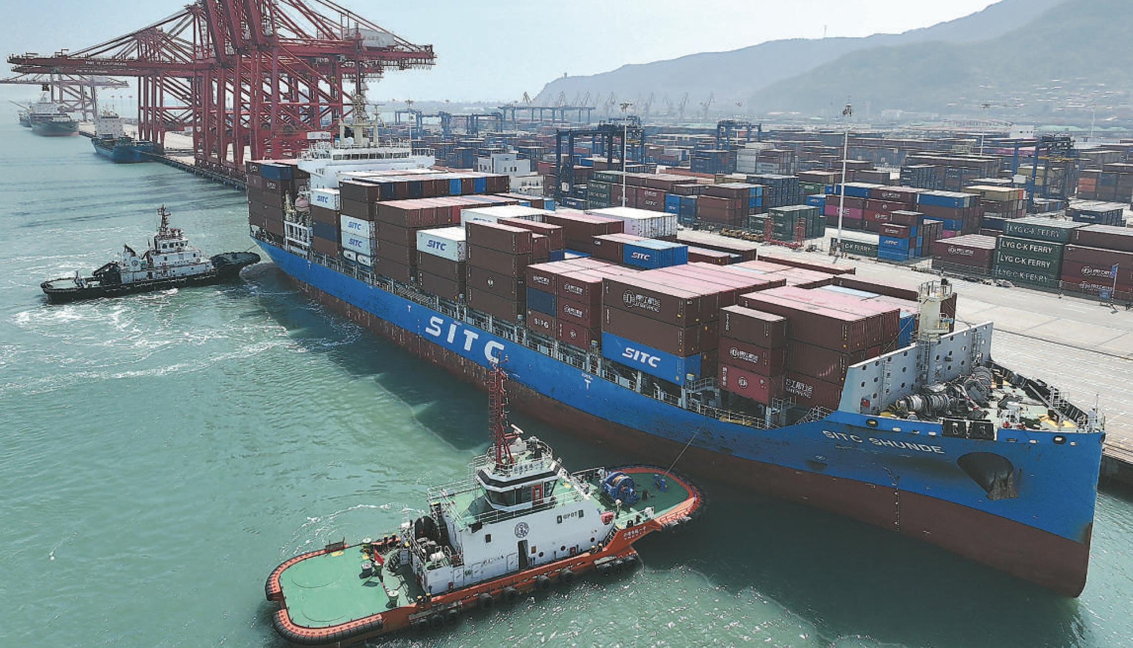 不久前,江苏省连云港一处集装箱码头,一艘满载集装箱的货轮缓缓驶进泊位。王春摄(人民图片)