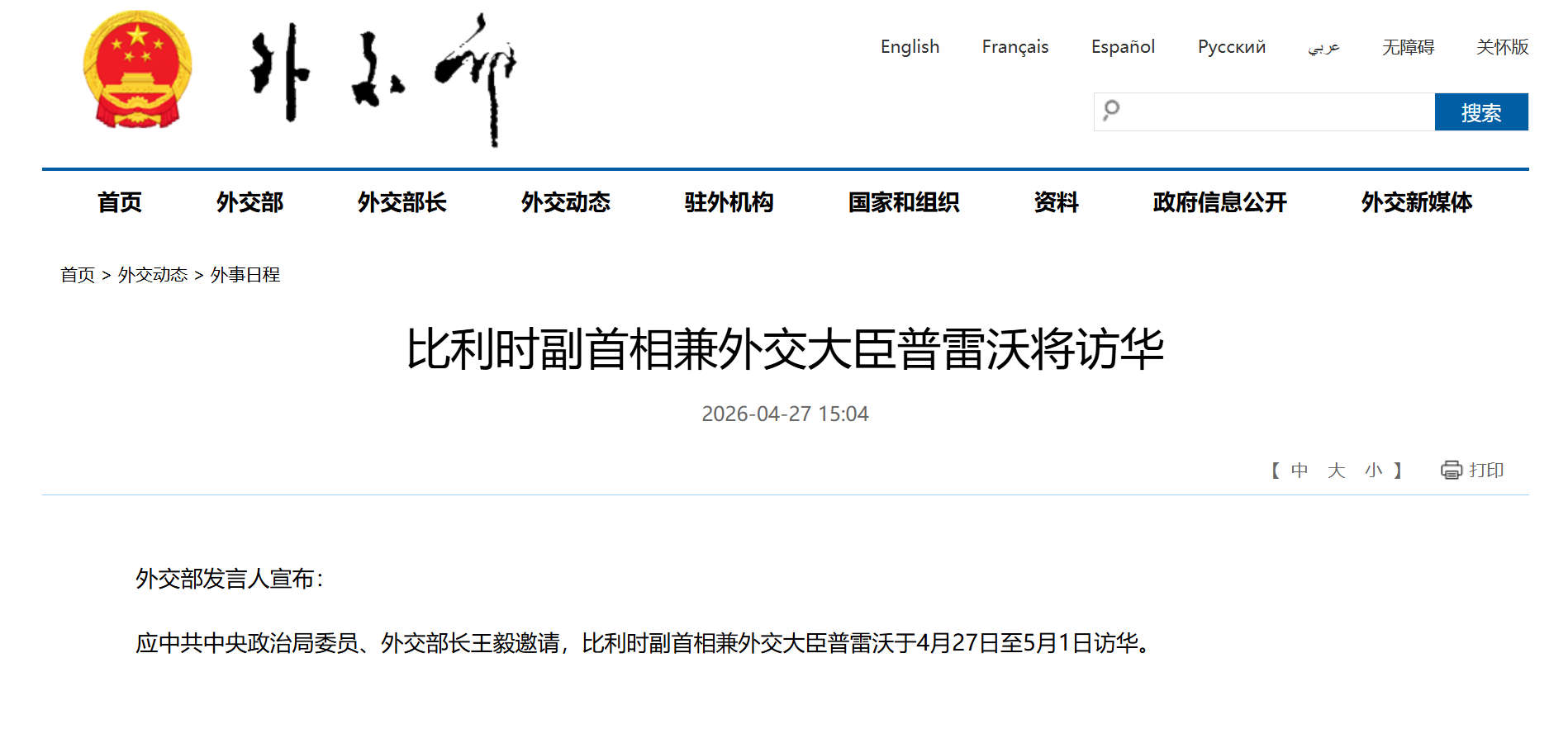 应中共中央政治局委员、外交部长王毅邀请,比利时副首相兼外交大臣普雷沃于4月27日至5月1日访华。