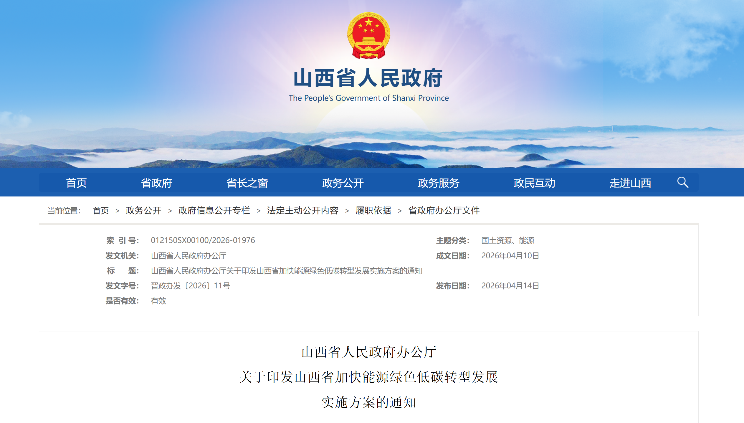 近日,山西省人民政府办公厅印发《山西省加快能源绿色低碳转型发展实施方案》,方案围绕加强化石能源清洁高效开发利用、加快建设新型电力系统、加快培育绿色能源消费体系、创新能源绿色低碳发展政策机制、健全完善保障措施五大板块统筹推进,全面覆盖各领域重点任务。