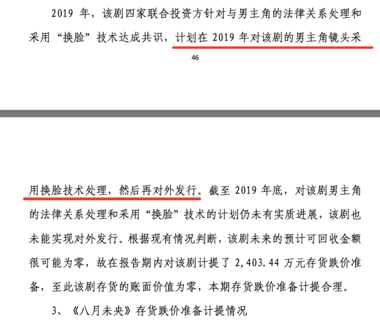 但截至2019年底,“换脸”计划仍未有实质进展,该剧也未能实现对外发行。大晟文化当时表示,该剧未来的预计可回收金额很可能为零,公司在2019年年报中,对该剧再次计提了约2400万元存货跌价准备,至此该剧存货的账面价值为零。