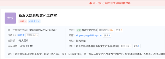 企查查显示,上海明邑影视文化工作室、新沂大筑影视文化工作室均已注销。