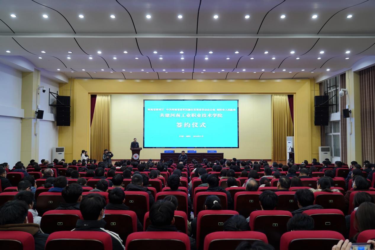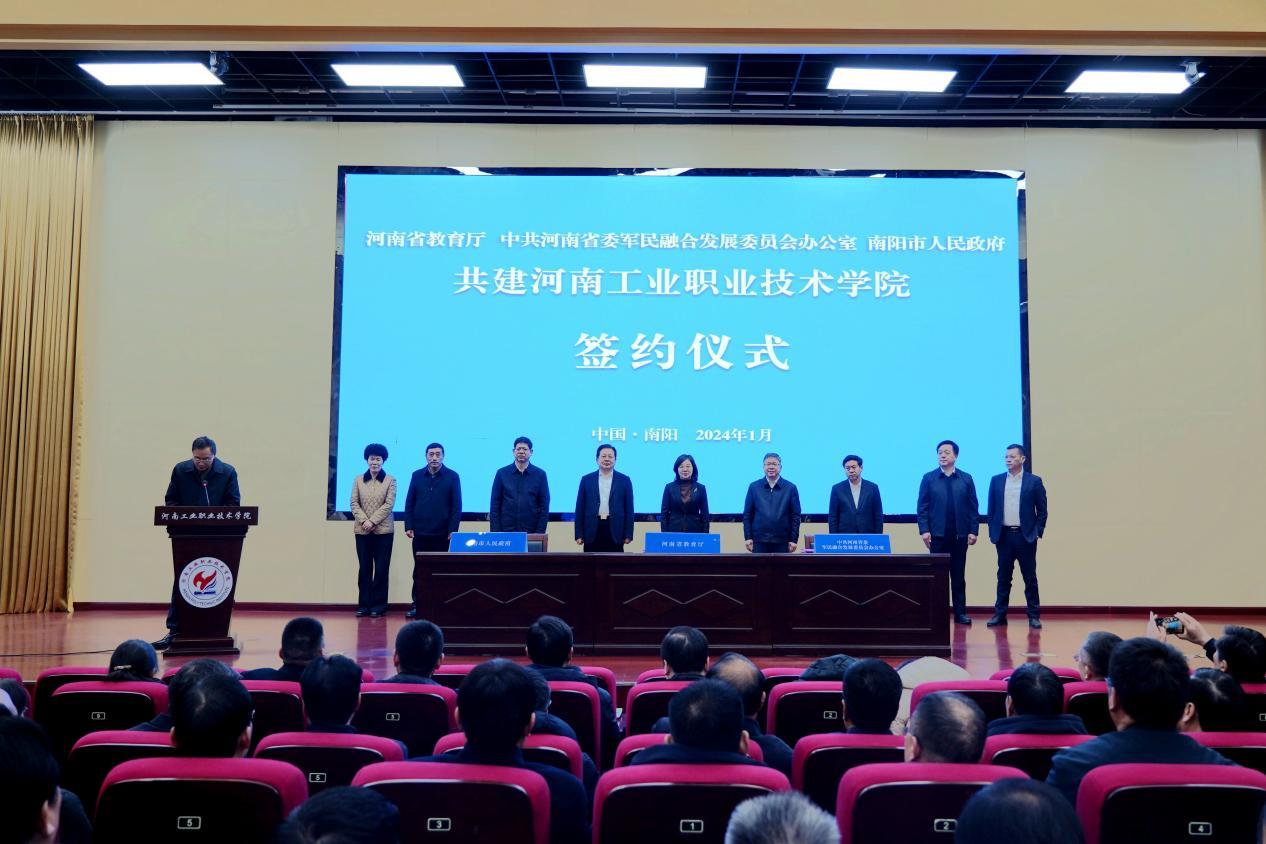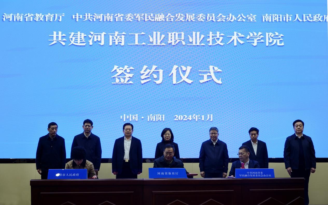 1月16日下午,河南省教育厅、中共河南省委军民融合发展委员会办公室、南阳市政府共建河南工业职业技术学院签约仪式在该校孔明路校区隆重举行。省委教育工委副书记、省教育厅党组书记、厅长毛杰,省委军民融合发展委员会办公室常务副主任唐远游,南阳市委书记朱是西,南阳市委副书记、市长王智慧,省委军民融合发展委员会办公室副主任孙岗,南阳市副市长阿颖,南阳市政协副主席、市教育局党组书记、局长杨文普出席签约仪式。签约仪式由省委教育工委专职委员何秀敏主持。省教育厅、省委军民融合办、南阳市相关单位部门负责人,河南工业职业技术学院党委书记温道军、校长王伟及领导班子成员、全体中层干部、师生代表参加签约仪式。