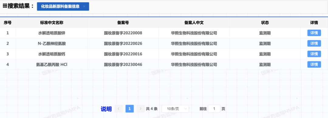 华熙生物科技股份有限公司以4个新原料备案数量位列第三,备案的新原料分别是N-乙酰神经氨酸、水解透明质酸钙、水解透明质酸锌、氨基乙酰丙酸HCl。