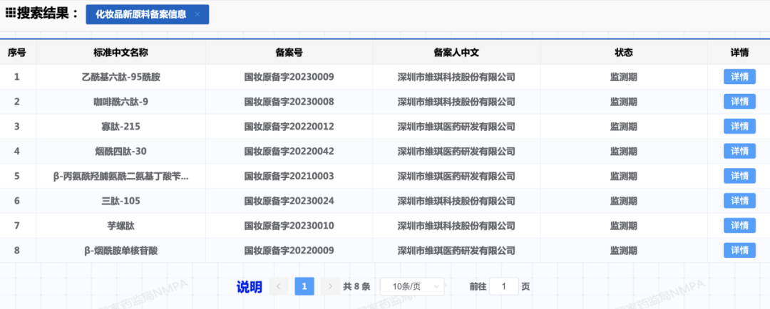 按照备案人信息统计,深圳市维琪科技股份有限公司(曾用名:深圳市维琪医药研发有限公司)以8个新原料备案数量拔得头筹。在过去3年,该公司陆续完成了β-丙氨酰羟脯氨酰二氨基丁酸苄胺、烟酰四肽-30、寡肽-215、β-烟酰胺单核苷酸、三肽-105、芋螺肽、乙酰基六肽-95酰胺、咖啡酰六肽-9原料备案,均进入了监测期。