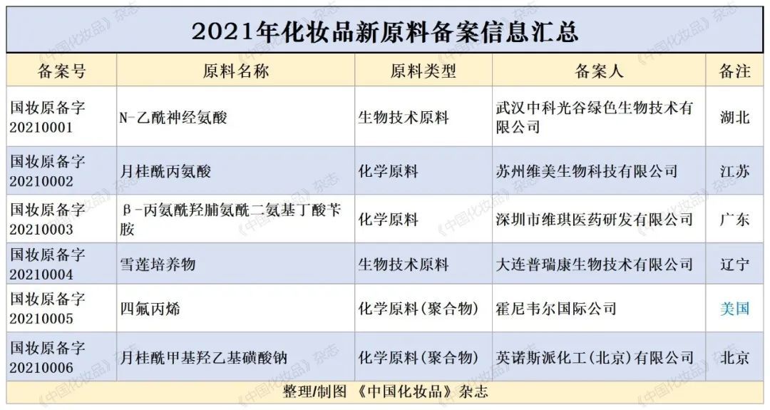 2021年1月12日,《化妆品注册备案管理办法》(以下简称“《办法》”)发布,细化了化妆品、新原料的注册/备案管理制度,强化了备案后的监督管理与创新机制。《办法》从2021年5月1日开始正式实施,所以该年度化妆品原料备案集中在下半年,数量只有6个,但其意味着国内化妆品市场的船队开始从“重营销”转舵,步入全新的原料与科技时代。