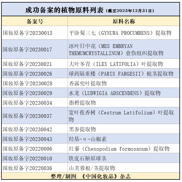 3年里共有13种新原料被明确标记为“植物原料”。其中,2023年备案的植物原料达到10种,尤其到了2023年后半年,中国特色植物原料备案的频率明显提高。