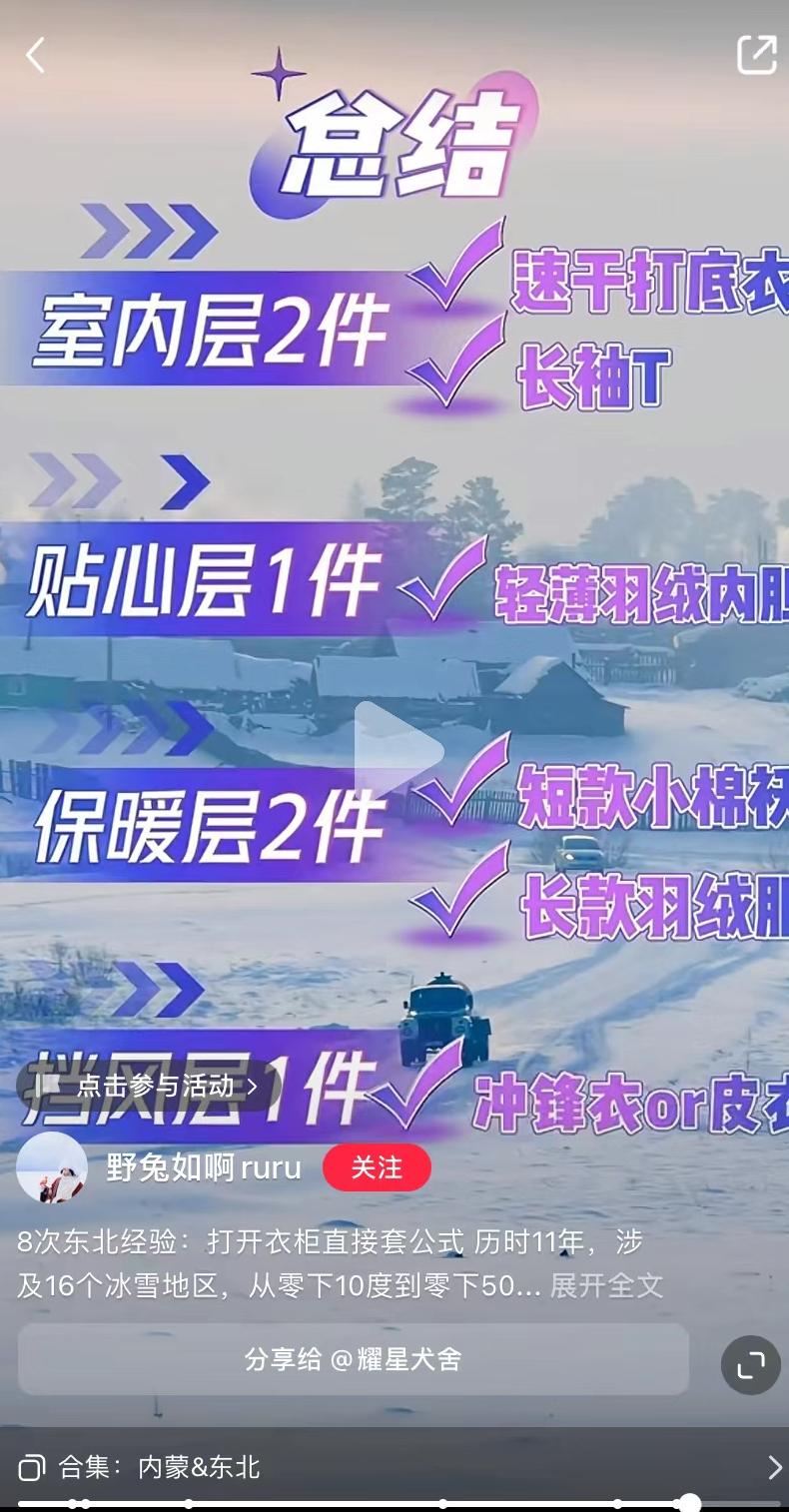 “速干衣加速干裤穿在最里面一层,下装外面可以穿一条羽绒裤,上衣我个人是选择了一件可以两面穿的带绒外套……”在小红书平台,类似于这类讲解东北穿搭的笔记近来成为热点,个别博主点赞量高达3万+,大家更是将这类穿搭称为“零下40摄氏度保命建议”。