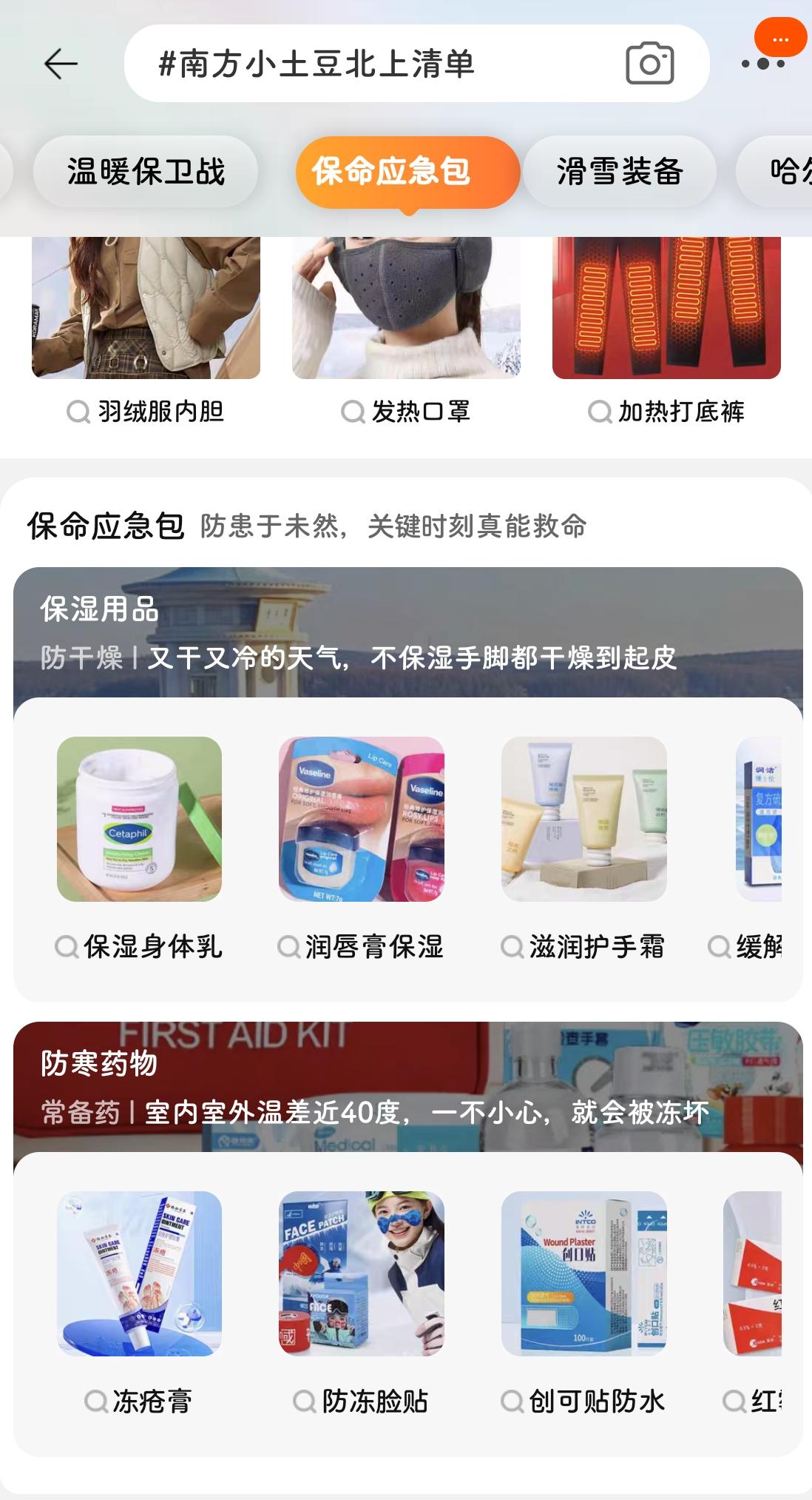 打开某宝网购平台热搜,“#南方小土豆北上保命清单”位居第四,东北保暖公式、温暖保卫战、保命应急包、穿搭图鉴……点击任意选项,都有相对应的单品推介。其中,保命应急包选项内更是细致到身体乳、冻疮膏、防冻脸贴等防寒商品和保湿商品。