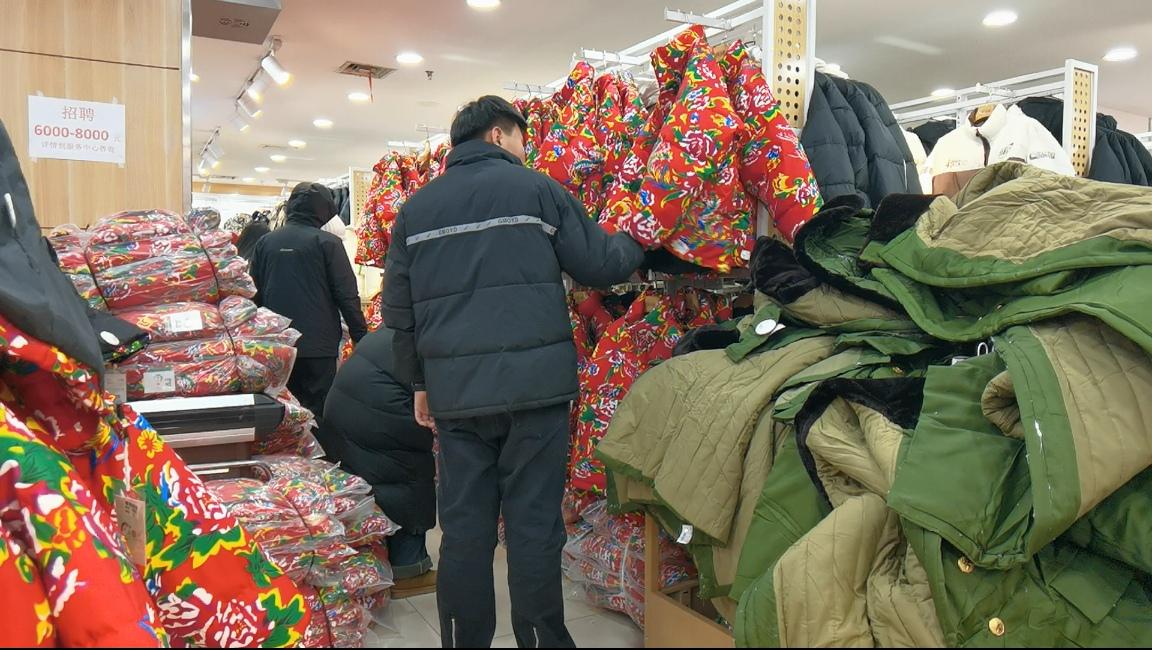 在一位男顾客的购物车里,装满了花棉袄、花马甲,可谓是满满的东北元素。通过交谈记者了解到,这位来自河北的游客已经在哈尔滨游玩了4天,这是第二次来购物,第一天刚到达时在这里买了游玩需要穿的衣服,感觉保暖性很好,而且鞋子很防滑,重点是价位很合适。现在即将返程回家,想选购一些带有东北元素的棉马甲和花袄,回去当纪念品送给家人。
