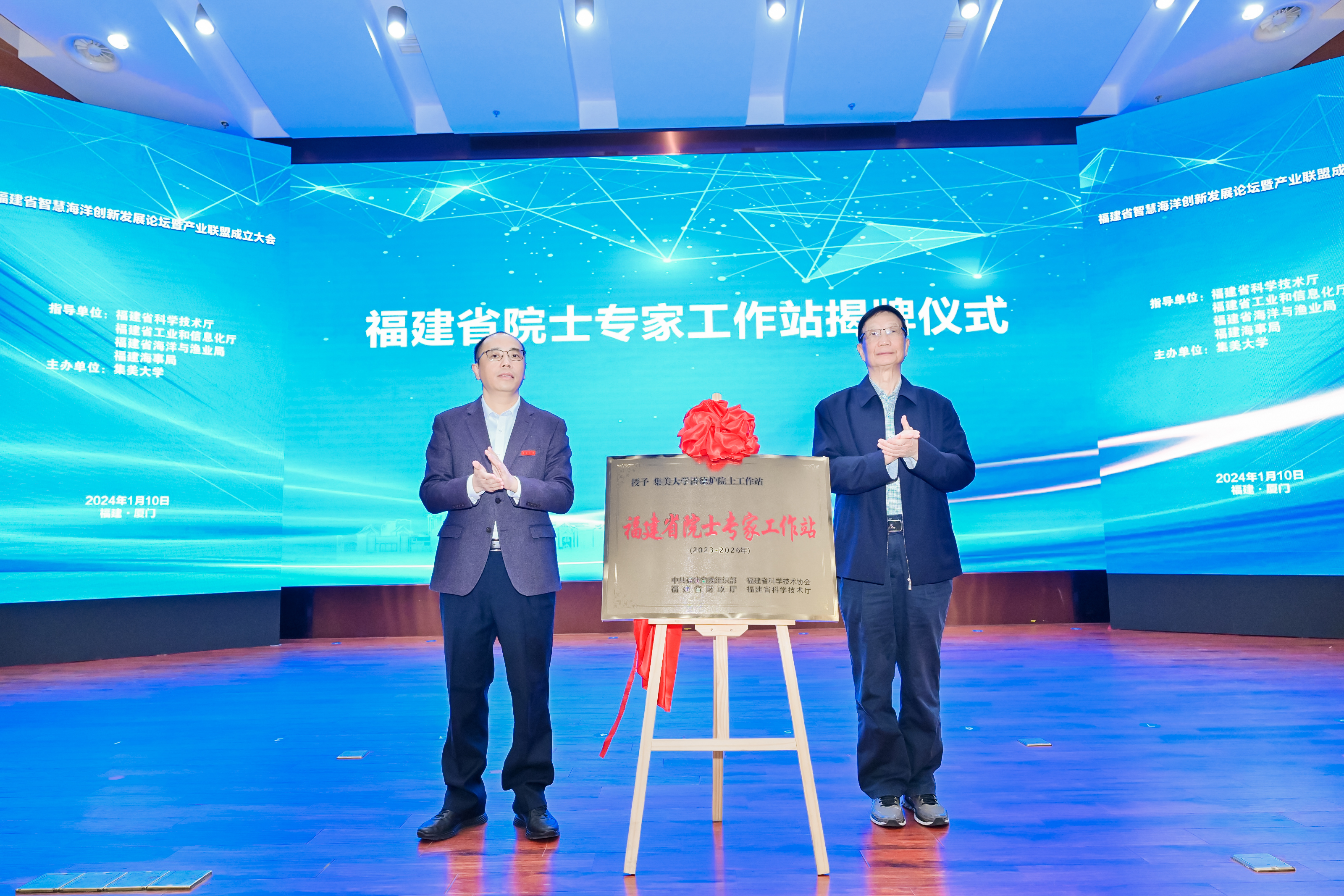 成立大会上,指导单位福建省科学技术厅、福建省工业和信息化厅、福建省海洋与渔业局、福建海事局代表为联盟成员单位颁发荣誉牌匾。校长谢潮添与中国工程院院士潘德炉共同为福建省院士专家工作站揭牌。集美大学多个涉海学院与相关企业签订项目合作协议,共同开发建设一批智慧海洋特色项目。