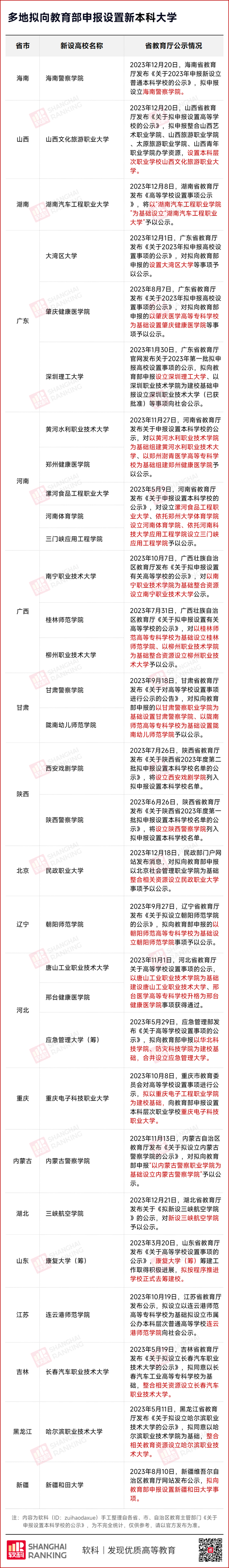 据不完全统计,各省、市、自治区已进行相关本科高校设置事项公示、拟向教育部申报的新设本科院校至少有31所。