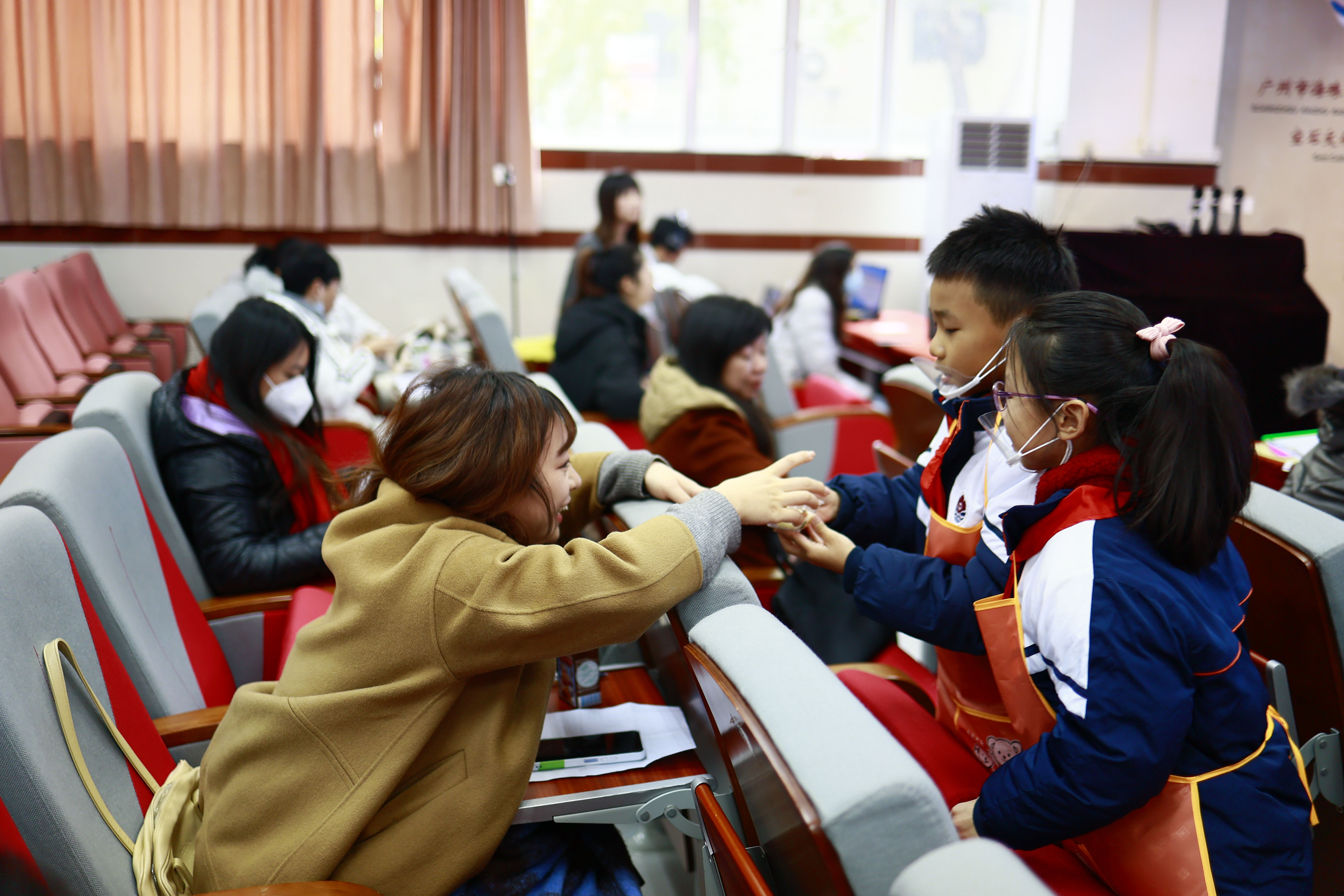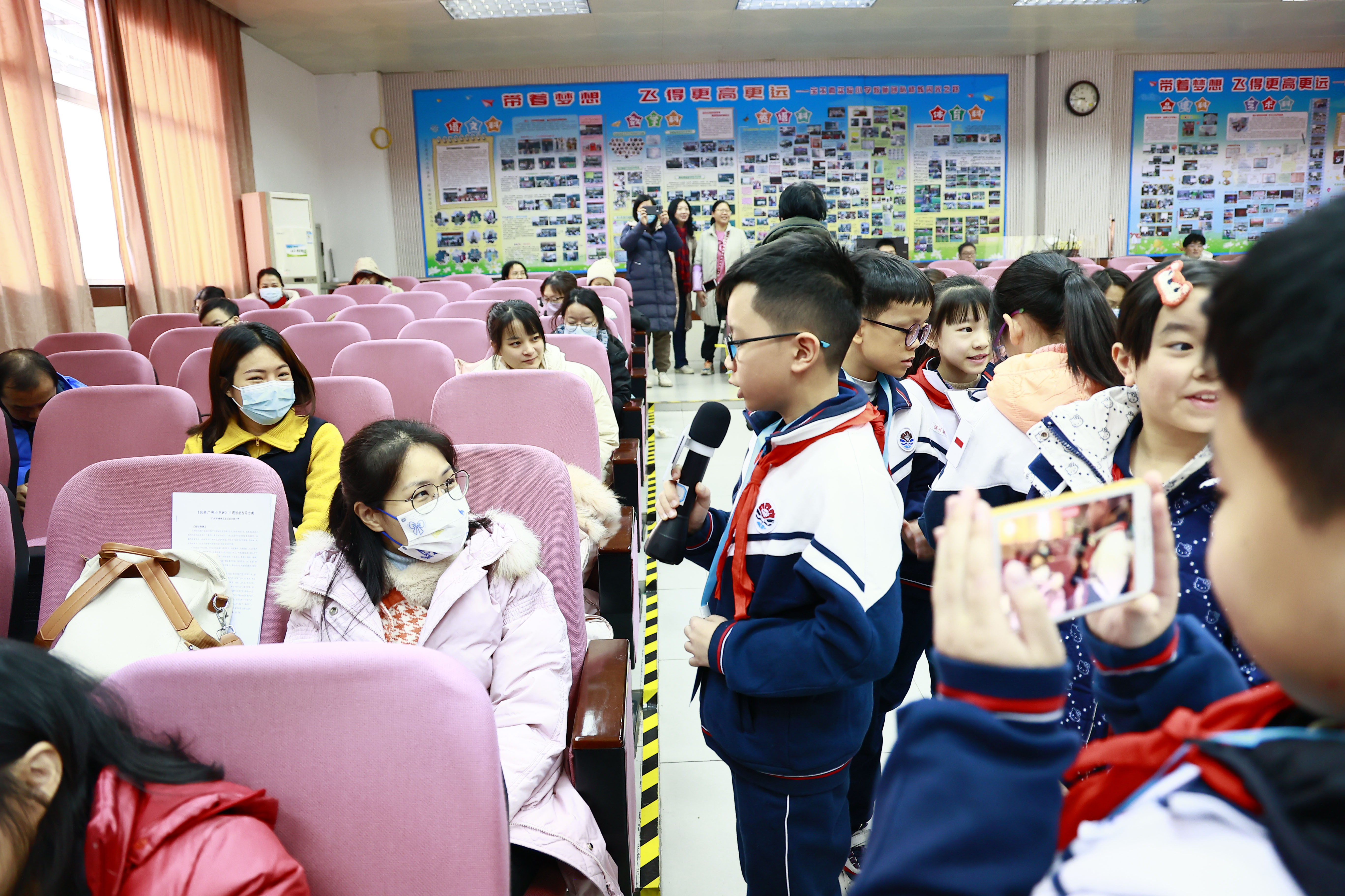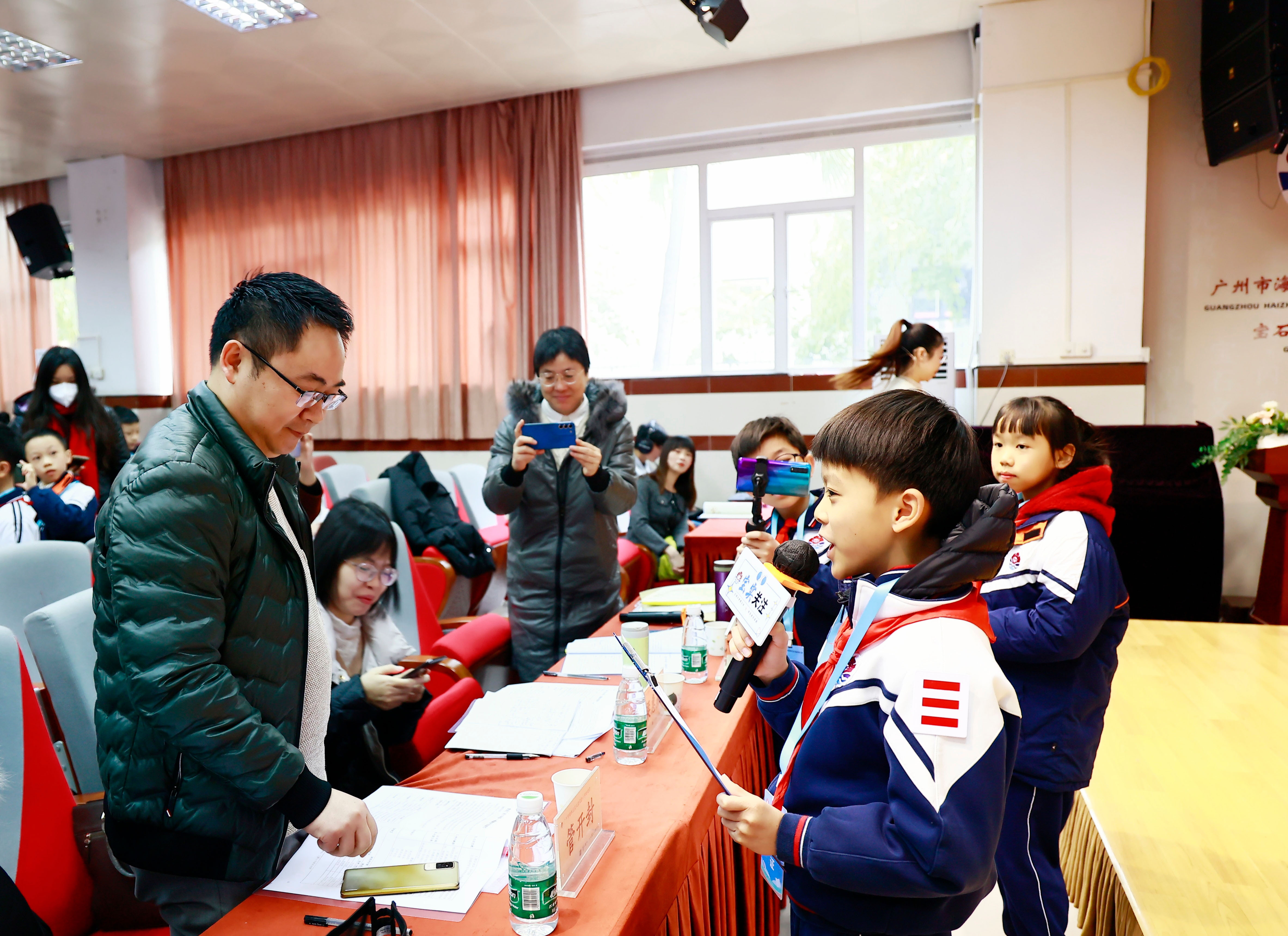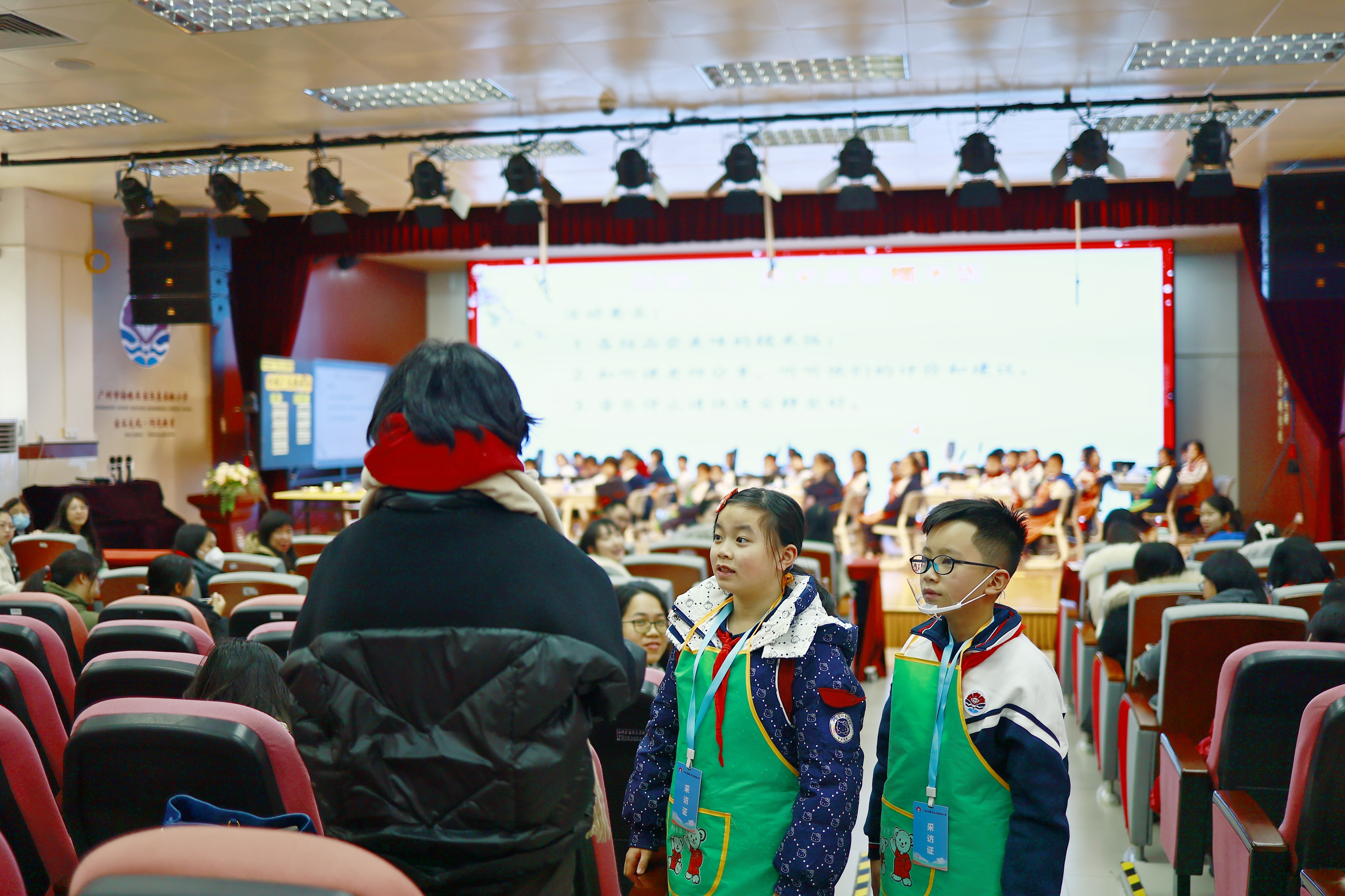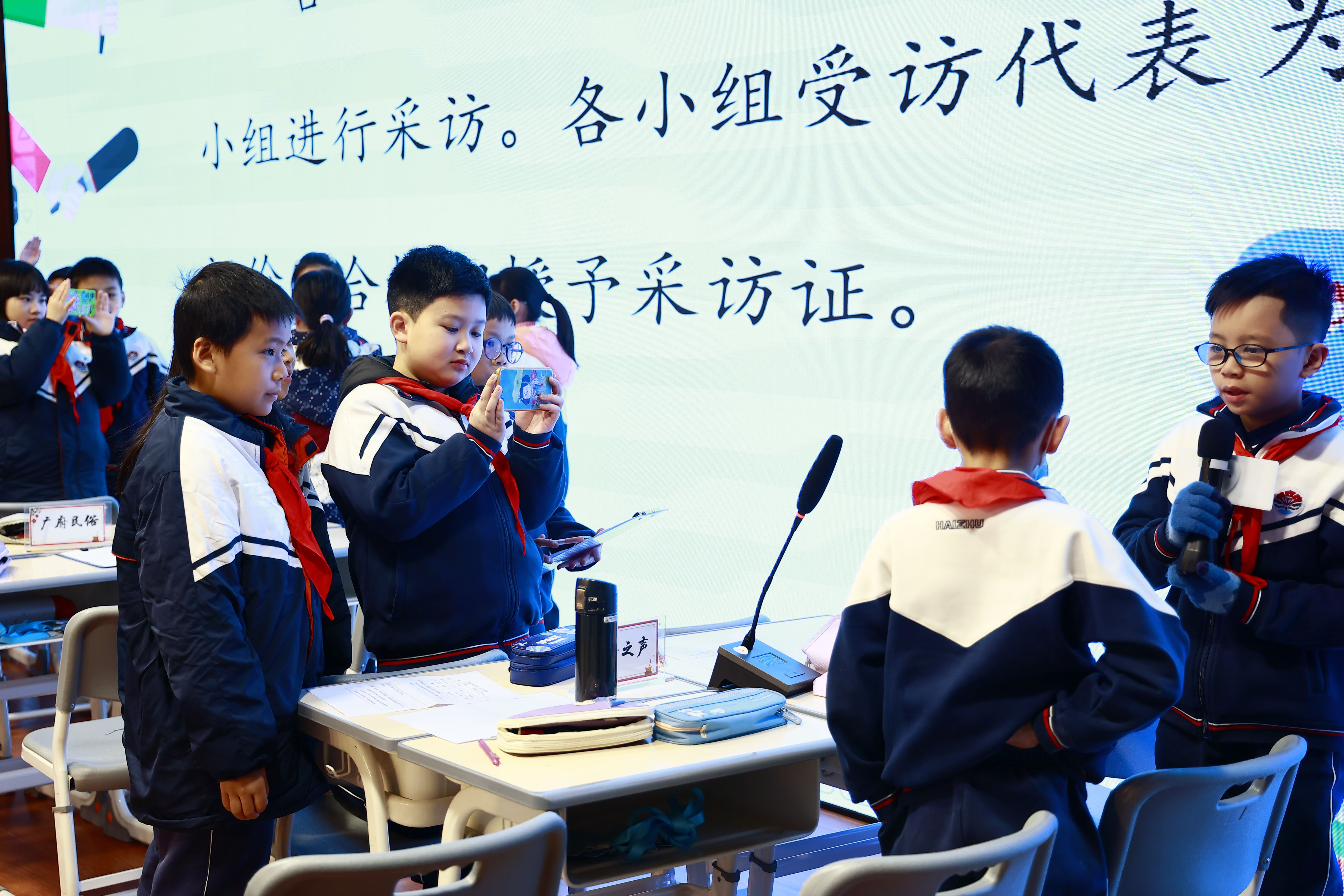 活动第二个环节是海珠区宝玉直实验小学综合实践活动、劳动科组骨干教师作课例展示。第一节课是由董玲舒老师带来的《我是广府小导游——采访方法指导课》。董玲舒老师是广州市中小学综合实践活动学科中心组成员,获广州市中小学综合实践活动学科教师教学技能大赛三等奖。董老师通过创设情境,激发学生采访需求。学生通过学习技能、模拟演练、展示交流、反思总结等,习得采访方法,掌握采访技能。董教师鼓励学生运用所学方法现场采访听课老师,学生们纷纷走入会场,走到老师们身旁,积极邀请听课老师参与采访活动,现场互动氛围热烈。