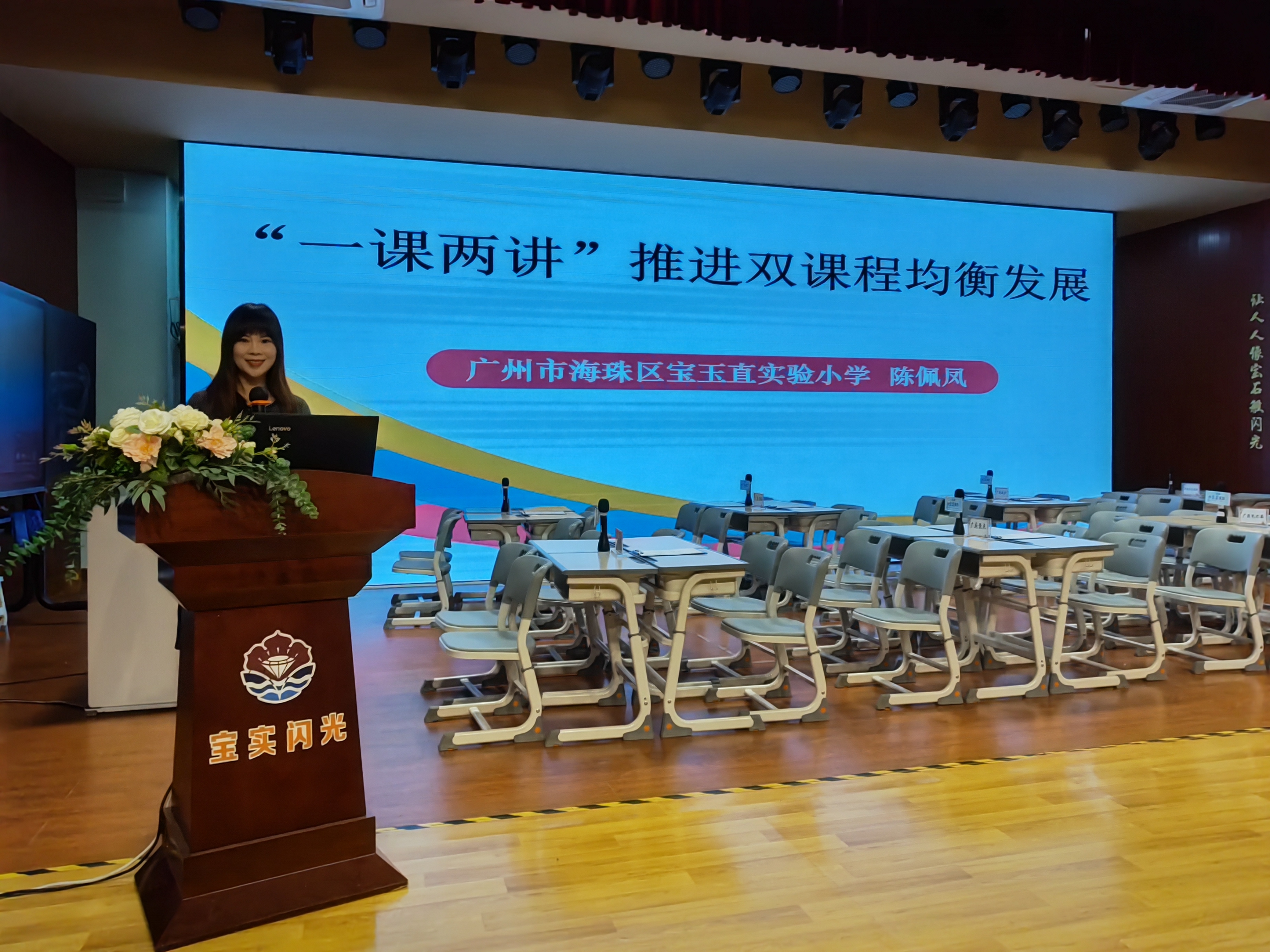 活动的第一个环节是由陈佩凤科长代表学校作专题分享,陈科长介绍了广州市海珠区宝玉直实验小学综合实践活动、劳动科组的整体情况,展示了宝实综合实践活动、劳动科组的课程建设情况和阶段性研究成果。陈科长围绕深度教学理念下的学科课程开发与实施,重点介绍了何为“一课两讲”, 为什么要进行“一课两讲”以及怎样进行“一课两讲”,同时,具体介绍了本次教研活动中展示的《我是广府小导游》主题活动,通过案例讲解,让与会老师直观感受“一课两讲”操作模式。