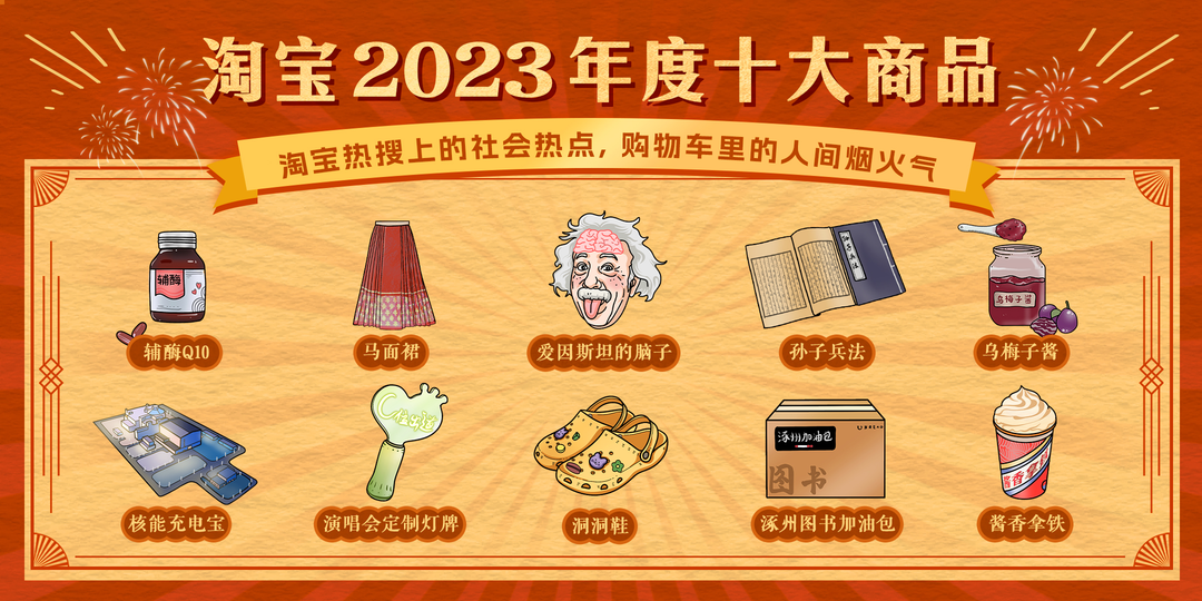 12月25日,淘宝公布2023年度商品榜单,《孙子兵法》、酱香拿铁、涿州图书加油包、“爱因斯坦的脑子”、演唱会定制灯牌、马面裙、洞洞鞋、“玲龙一号”核能充电宝、乌梅子酱、辅酶Q10共十件商品入选。