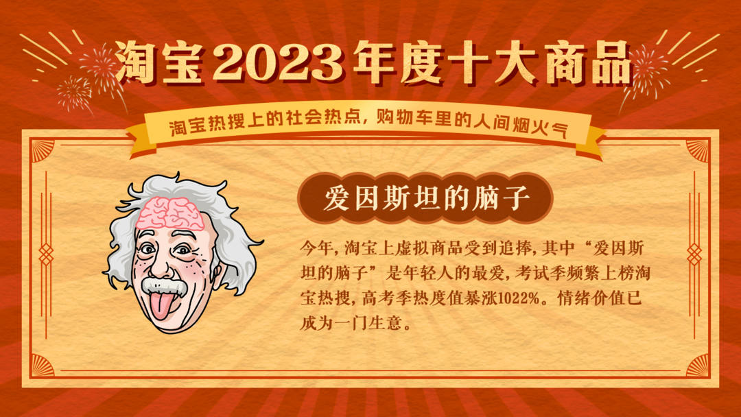 在今年的入选商品中,“爱因斯坦的脑子”独树一帜,它也是历年来首个入选淘宝年度商品的虚拟商品。这是淘宝上近年兴起的一种情绪价值服务产品:卖家把爱因斯坦头像的图片挂在商品页上,通常标价几毛钱,号称拍下这个链接就能“自动长脑子”。本质上,这是年轻人给自己加油打气,或者朋友们互动图开心的“小仪式”。
