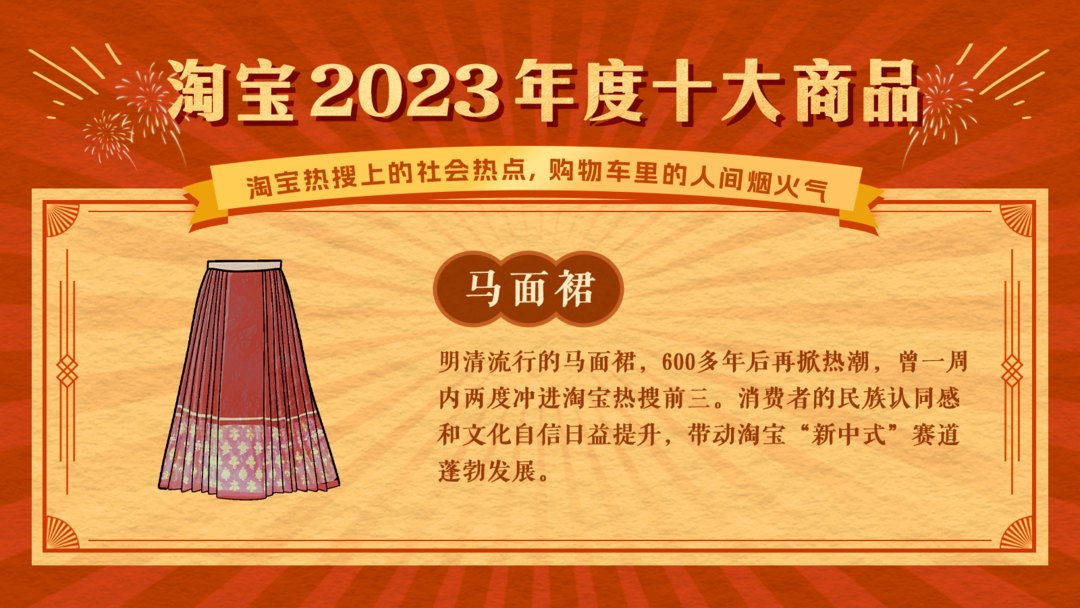 马面裙作为今年最热门的国风服饰单品,入选“淘宝2023年度商品”众望所归。近年来汉服热持续升温,而马面裙实穿百搭,工作日通勤、节假日拍照皆宜,今年以来颇受青睐。今年双11,淘宝平台卖出了超73万条马面裙,能铺满105个足球场。