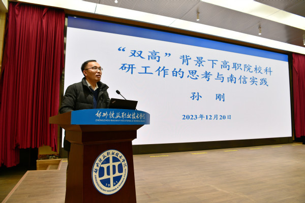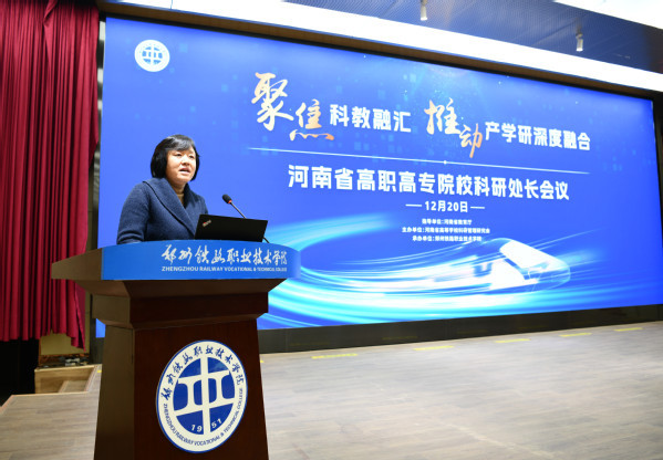 12月20日,河南省高职高专院校科研处长会议在郑州铁路职业技术学院召开。会议的主题是“聚焦科教融汇,推动产学研深度融合,突破高职院校科研瓶颈,促进省内高职院校科研高质量发展”。河南省教育厅科技与信息化处一级调研员施晓春、郑州铁路职业技术学院校长马玉霞出席会议,来自全省54所高职院校的科研处长参加会议。会议由郑州铁路职业技术学院副校长倪居主持。