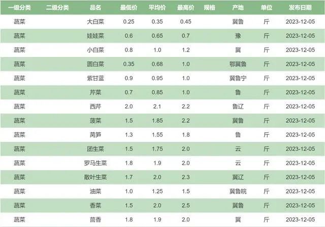 据21世纪经济报道,北京新发地价格行情显示,12月1日大白菜均价为0.33元/斤,较去年同期下降34%。市场分析师表示,是近5年同期的最低点。