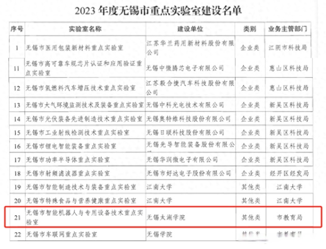 近日,无锡市科技局公布了《2023年度无锡市重点实验室建设名单》,无锡太湖学院“智能机器人与专用设备技术重点实验室”成功获批。无锡市重点实验室为无锡市首次申报评选,是全市科技创新体系的重要组成部分,是高等学校学科建设的重要载体,也是组织高水平基础研究和应用基础研究、聚焦和培养优秀科技人才、开展高水平学术交流的重要基地。