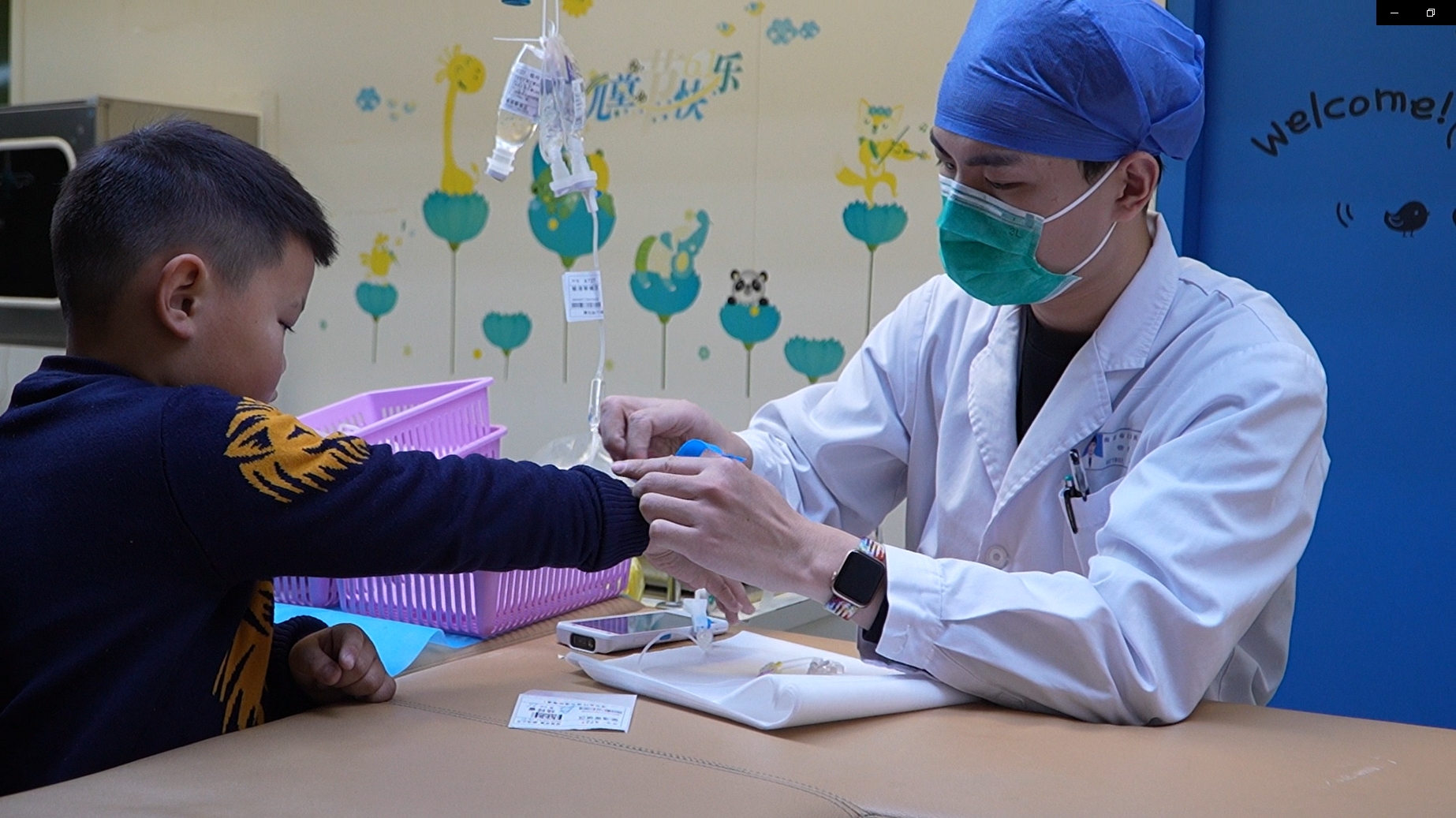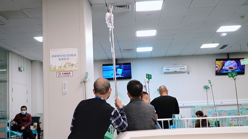 “爸爸,你又输了!”“这次我出了剪刀,就知道你会出布!”在急诊二楼的输液室,童童(化名)正在打点滴,几瓶水刚挂了一半,此时虽然他手上插着输液管,看上去有点虚弱,但脸上还是挂着笑容,爸爸正在陪他玩“石头、剪刀、布”的游戏,每当赢了爸爸,他就哈哈哈直笑。“孩子患上流感了,高烧达39℃多,已经陪他挂水两三天了。天天手上插针孩子很痛苦,输液时间长也痛苦,只能陪他玩玩游戏,逗他开心,能减轻他的一点痛苦都是好的!”