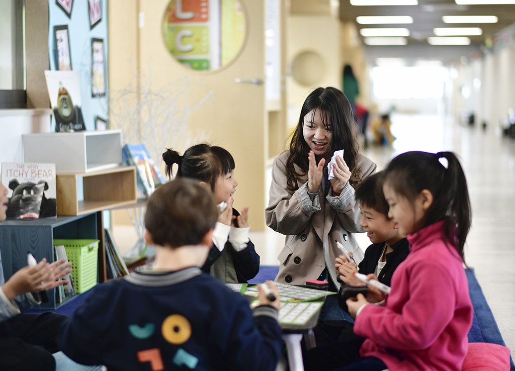 记者看着这样的课间活动,很快意识到:在云谷学校,课间适配设施的使用率是非常高的,即使是一条走廊、一面墙壁、一块玻璃。“除了专业的建筑设计师外,我们的许多一线老师都参与了学校的设计,比如把图书馆改为学习中心,放在整个校园最中心的位置,让校园里的每一个人都能方便地来到这里。除了书籍区,还有许多自由交谈、研讨、舒适阅读的区域,孩子们趴在地毯上、窝在懒人沙发里阅读,老师们三五人围坐畅聊;两层之间以木质的‘大楼梯’相连,阳光透过一整面落地窗散落在地板上,很多美妙的分享会常常在这里进行。这些设计也是为了学校最本质的理念——让分享、合作无时不刻在校园里发生。”冯校长介绍道。我们也常在不经意间体会到孩子们与建筑的深度链接:为什么云谷的落地玻璃墙上被绘制满了五彩斑斓的图画?原来一群小学生发现,透亮的落地窗前常有鸟撞现象,为了让飞行中的小鸟不再受伤,他们自发地动手,结合在课堂上习得的版画、油画等技能,设计了各有匠心“防鸟撞图案”。